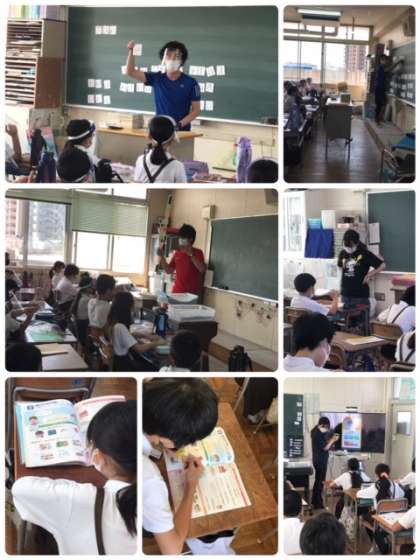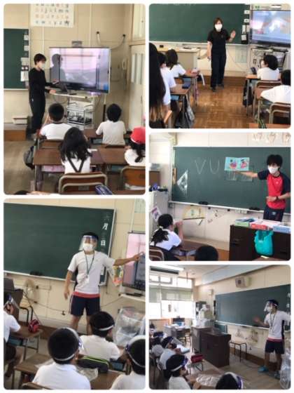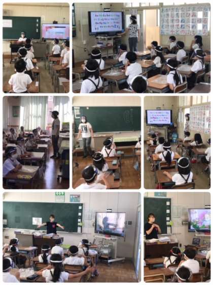 全学級同時にスタートです。学校中で英語が交わされています。みんなで声を出す時にはフェイスシールドをつけるなど感染予防にも気をつけています。エアコンと換気も行い、同時に熱中症にも気をつけています。