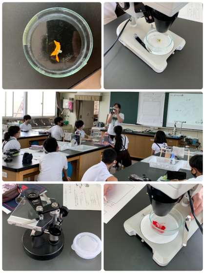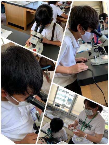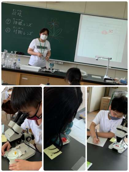 先週から2種類の顕微鏡の使い方を藤浪先生から学んでいます。感染予防対策をしたうえで、器具の使い方や観察して気づいたことなどをワークシートや観察カードに記入して体験学習をしています。