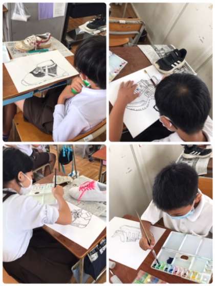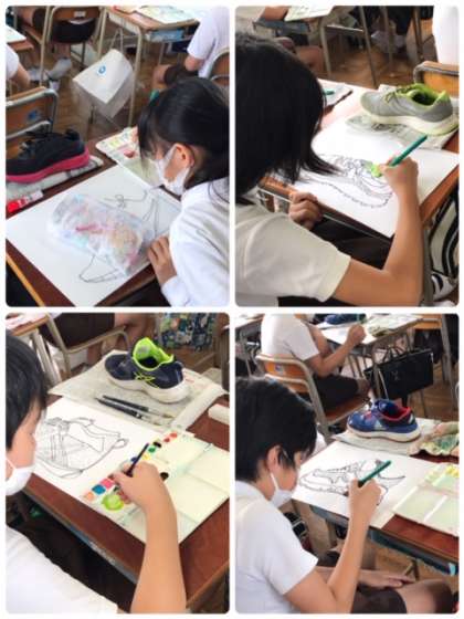 6年1組では、靴をよく見て描き、色を工夫して作り、つけていました。