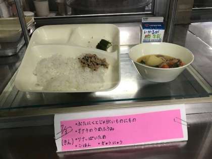 豚肉とジャガイモの煮物、オクラの梅風味、ツナっ葉炒め、ご飯、牛乳
