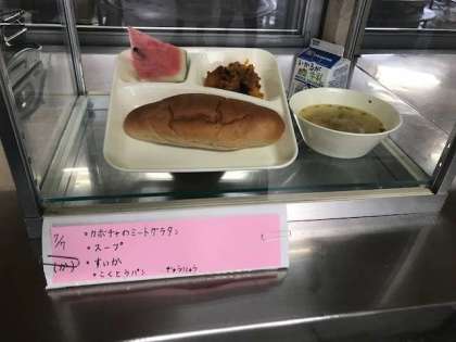 カボチャのミートグラタン、スープ、すいか、黒糖パン、牛乳