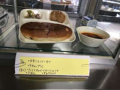 チキンカツレバー、ケチャップ煮、タコとキャベツのバジルソテー、おさつパン、牛乳