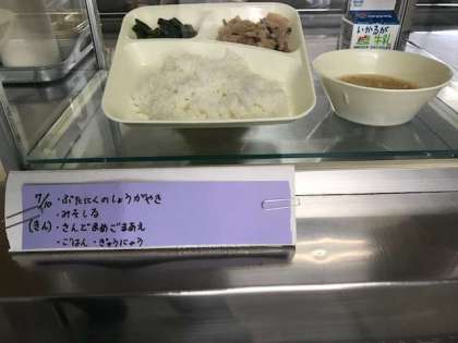 豚肉の生姜焼き、味噌汁、三度豆の胡麻和え、ご飯、牛乳
