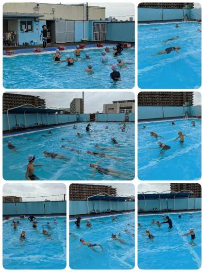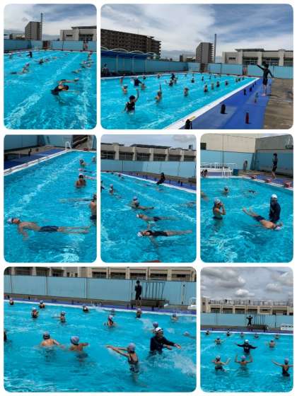 今週の火・水・金曜のプール水泳では、クロールの泳法を3段階に分けて学習しました。