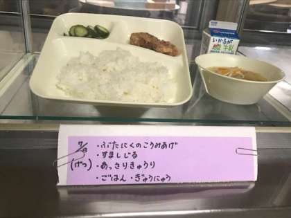 豚肉の香味揚げ、すまし汁、あっさりキュウリ、ご飯、牛乳