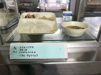 鮭のつけ焼き、味噌汁、冬瓜の煮物、ご飯、牛乳