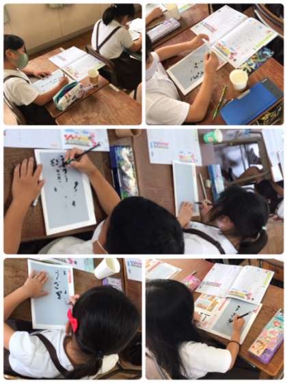 2組では、水書用筆を使って、書写の学習に集中して取り組めていました。