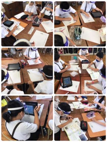 2組では、タブレットも活用しながら、ゴミについての新聞づくりに挑戦していました。