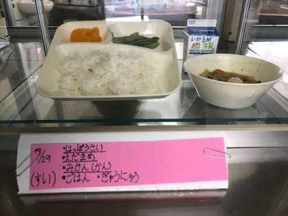 八宝菜、枝豆、みかん(かん)、ご飯、牛乳