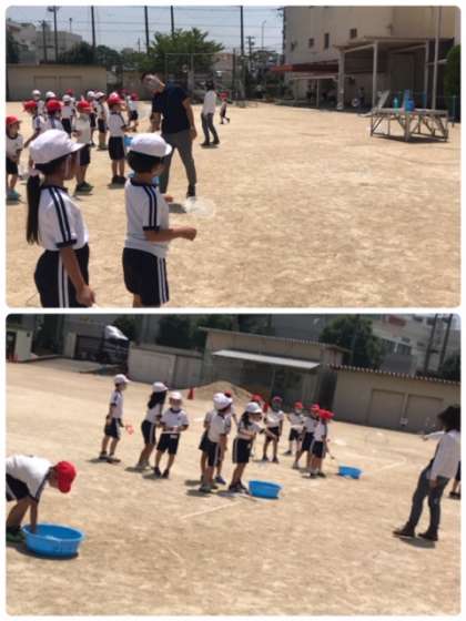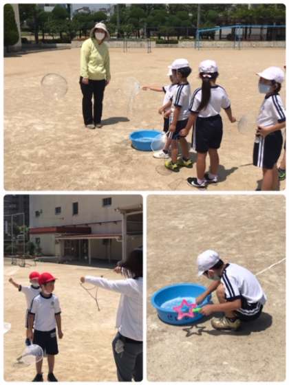 1年生が、運動場でシャボン玉に挑戦していました。写真にうまく写らないのが残念ですが、雰囲気は伝わるでしょうか?