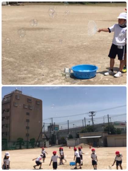 うちわのホネや、ひもなど、様々なものでシャボン玉を作りました。風が吹くと勝手にできるシャボン玉に、みんな大喜びでした。