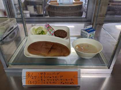 今日の給食の献立は、焼きハンバーグ、豆乳スープ、キャベツとピーマンのソテー、黒糖パン、牛乳です。