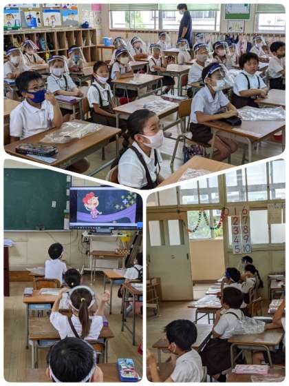 中学年は主人公ジムの物語を視聴し、先生の質問に答えたり、英語のジャンケンゲームをしたりしていました。