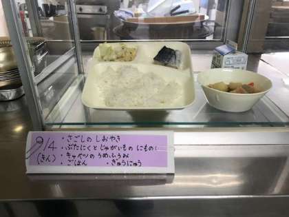 さごしの塩焼き、豚肉とじゃがいもの煮物、キャベツの梅風味、ご飯、牛乳