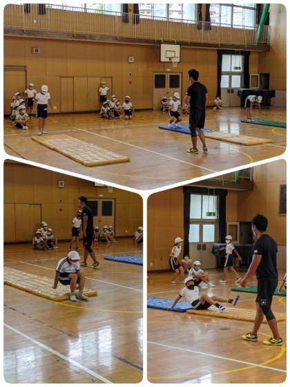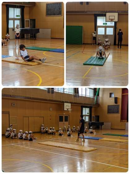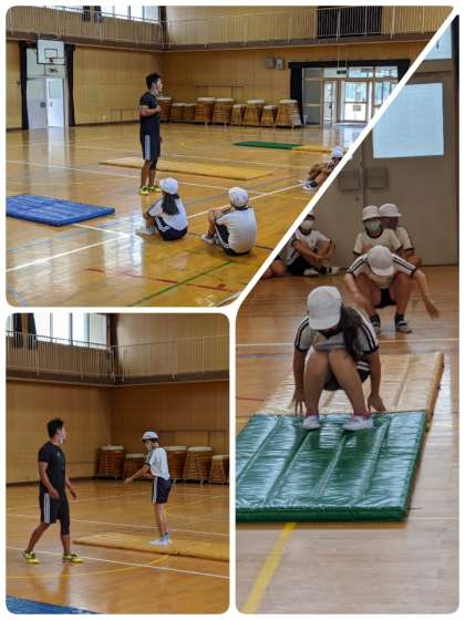 先週までは、プールでの水泳運動でしたが、今日から講堂(体育館)でのマット運動の学習に入りました。