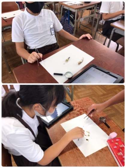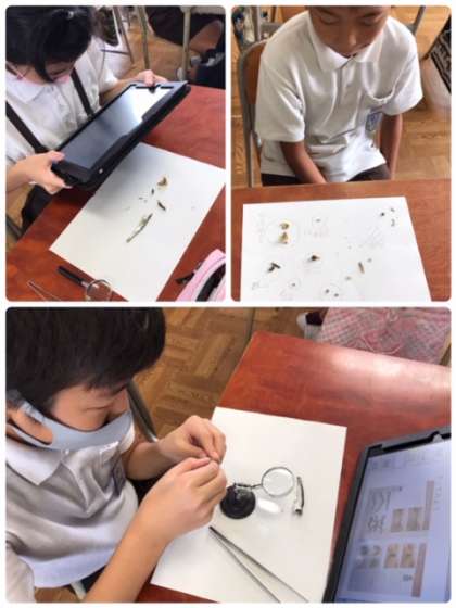 6年生は学習してきたことをつなげて、さらに発展させるために煮干しの解剖を理科で行いました。ヒトの体の作りとサカナの体の作りで同じところや違うところをみつけました。一人ひとりがタブレットを活用して記録をとり、主体的に学習していました。