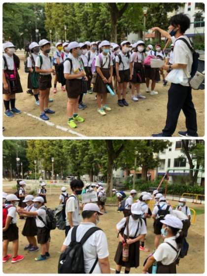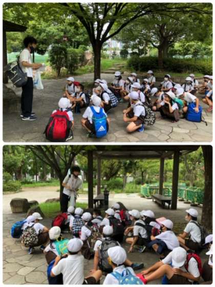 阿波座駅から、クラス別に行動しています。1組は、津波高潮ステーションで、防災学習。2組は、靱公園で、虫や植物をタブレットを用いて観察します。まもなく、2組の観察学習がはじまります。