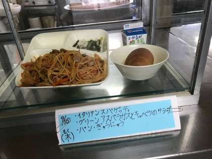 イタリアンスパゲッティ、グリーンアスパラガスとキャベツのサラダ、パン、牛乳