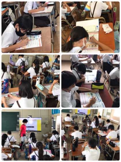 高学年では、実際に聴いた英語の質問にノートに答えを書いていっています。