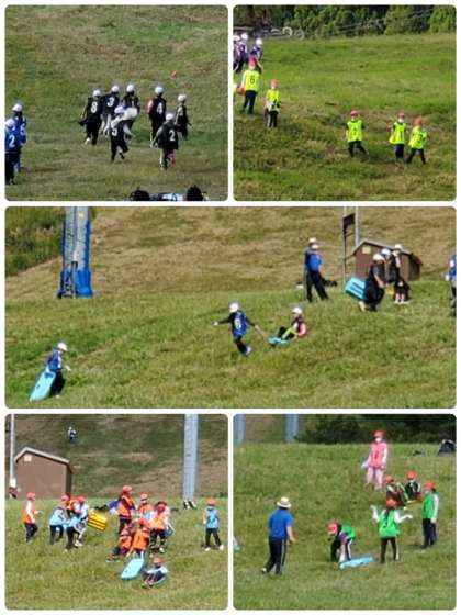 グループがローテーションで回りながら草すべり、フリスビーゴルフ、ボルダリングを楽しんでいます。
