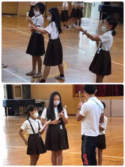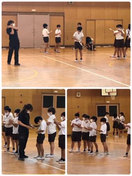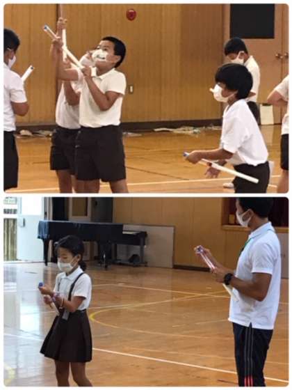 講堂で空気鉄砲を試しながら、どうして弾が飛ぶのか、空気の力について、目には見えないのですが、実際に試して、考えていました。