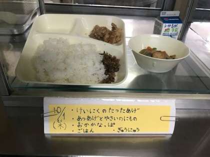 鶏肉の竜田揚げ、厚揚げと野菜の煮物、おかかナッパ、ご飯、牛乳