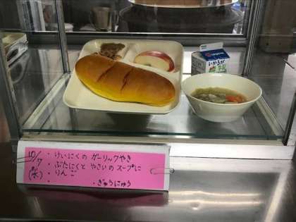 鶏肉のガーリック焼き、豚肉と野菜のスープ煮、りんご、パンプキンパン、牛乳