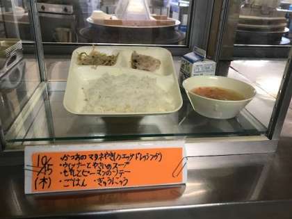 カツオのマリネ焼き、ウインナーと野菜のスープ、もやしとピーマンのソテー、ご飯、牛乳