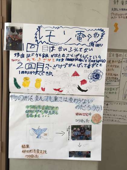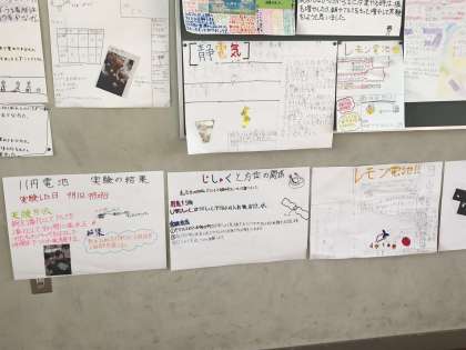 5年生が取り組んだ自由研究。その成果をまとめたものを理科室に掲示しています。