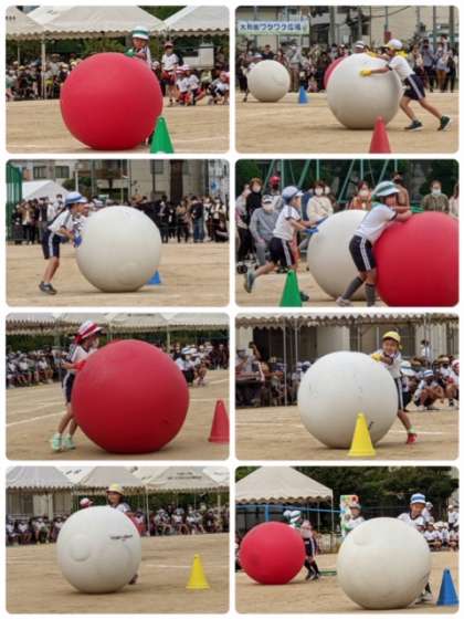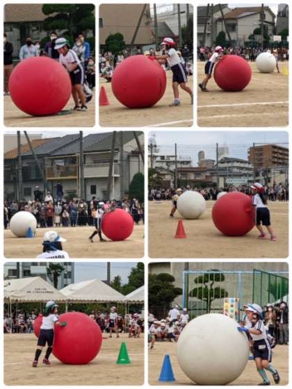 2年生による大玉ころりんです。なかなか大きな玉を転がすのは難しいようです。