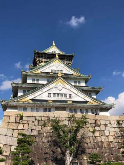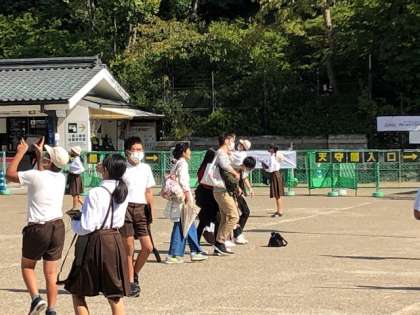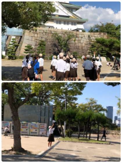 大阪城内の見学順を待つ間に、図工で使う大阪城の写真を撮影しています。いろいろな角度から撮影しています。