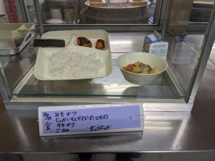 今日の給食の献立は、味噌カツ、じゃがいもと野菜の煮もの、焼きのり、ごはん、牛乳です。