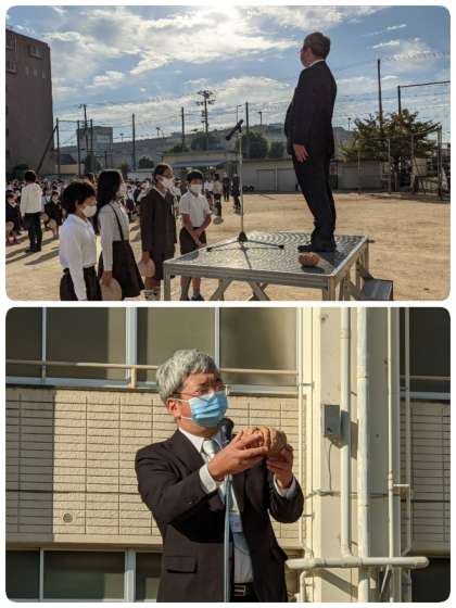 5年生が学習園で育てた「なにわの伝統野菜」の一つでもある大阪市西成区玉出が発祥の勝間南京(こつまなんきん)が立派に実り、その紹介を兼ねてのお話でした。