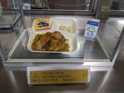 今日の給食の献立は、カツカレーライス、カリフラワーのピクルス、いり黒豆、牛乳です。