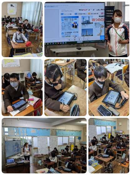 6年2組は1人1台のタブレットを使い、朝日小学生新聞のデジタル版を読み調べていました。