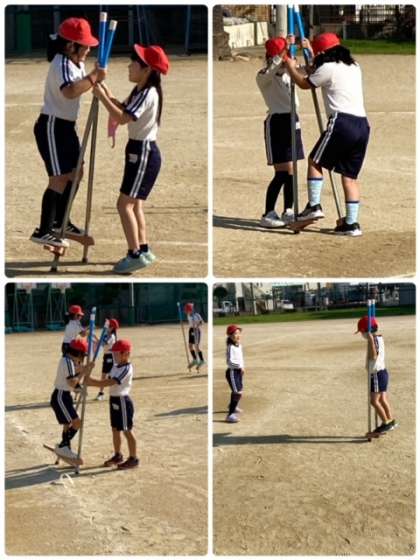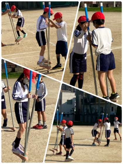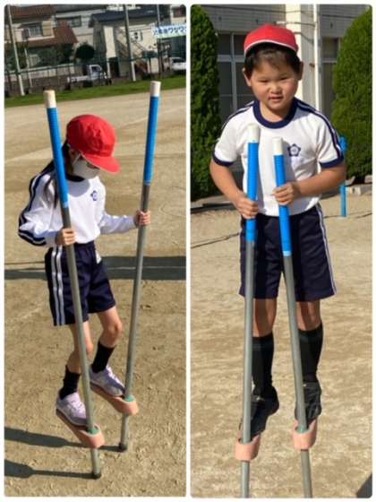 2年生が運動場で、竹馬の練習をしていました。コツは、前へ倒すようにすればいいと、教え合い助け合いながら練習していました。