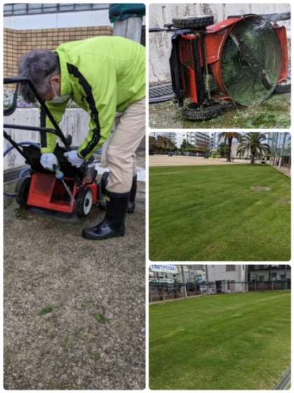 皆で踏んで(エアレーション)種蒔きをしたオーバーシードより50日が経ち、シッカリと成長したワクワク広場の冬芝。新型コロナの感染者が増えてきていますので、本日は、伸び過ぎた芝を刈ったり、雑草を抜いたりの芝生メンテを実行委員会の大人のみ9名で実施してくださいました。気温も随分と下がってきましたので、マスク着用はとても楽になったのですが、昨晩の雨で湿った芝は芝刈り機に絡みつき、何度も中断しながらの作業となりました。1時間半ほどのメンテの最後に山下さんが芝刈り機のお掃除もしてくださって、本日の作業を終了。