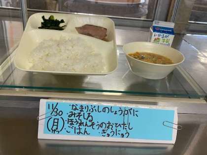 なまり節の生姜煮、味噌汁、ほうれん草のおひたし、ご飯、牛乳