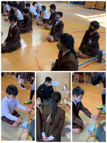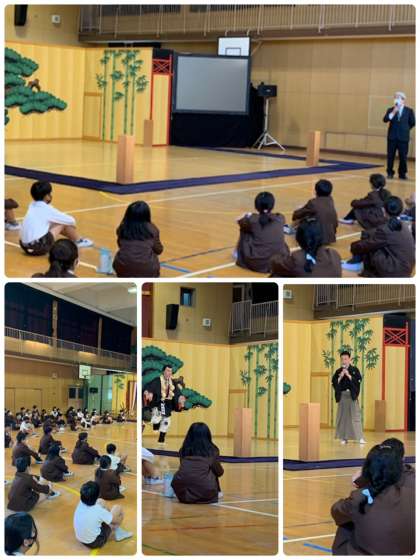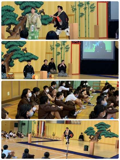 今回の本公演は、先月のワークショップで伝統芸能である能楽についての説明や、動作・振る舞い・謡などの体験をしたことをふまえたものです。