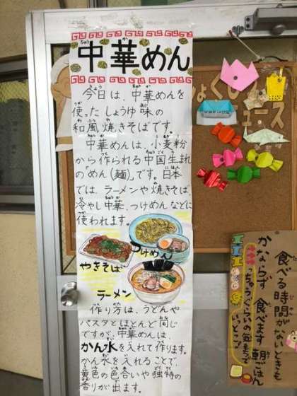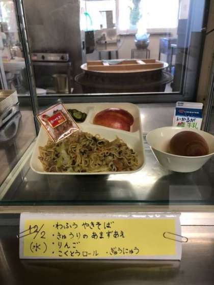 和風焼きそば、きゅうりの甘酢和え、りんご