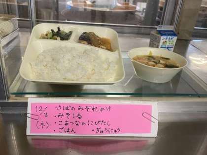 鯖のみぞれかけ、味噌汁、小松菜の煮びたし、ご飯、牛乳