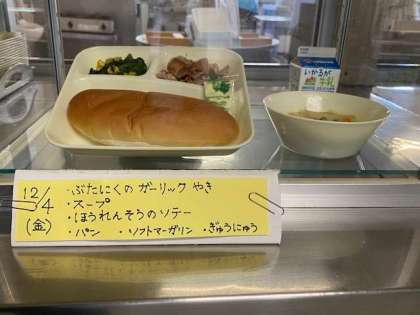 豚肉のガーリック焼き、スープ、ほうれん草のソテー、大型コッペ、ソフトマーガリン、牛乳