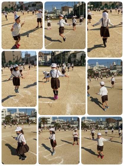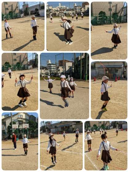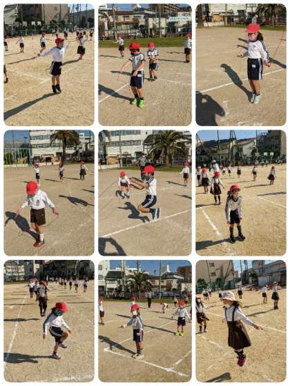 前跳び、後ろ跳び、かけ足跳び、二重跳びなどを中心になわとびします。