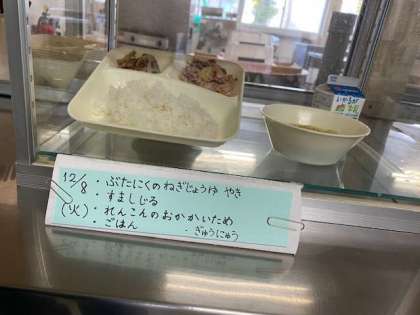 豚肉のネギ醤油焼き、すまし汁、蓮根のオカカ炒め、ご飯、牛乳