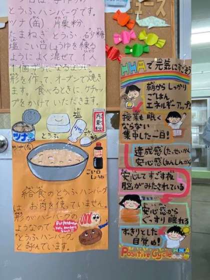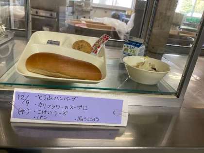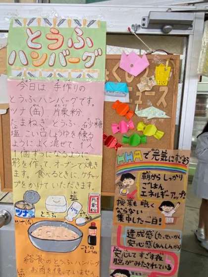 です。とうふハンバーグは、お肉を使わず、給食調理員さんがひとつずつ手作りでつくってくださっています。愛情を感じながら、美味しくいただきます!