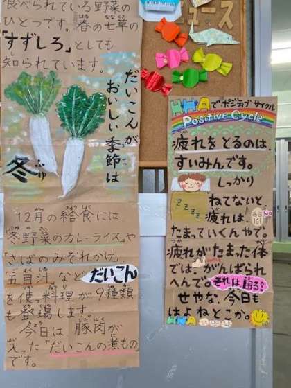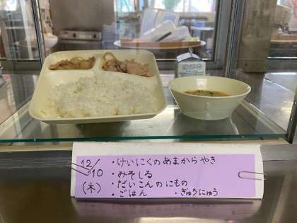 鶏肉の甘辛焼、味噌汁、大根の煮物、ご飯、牛乳