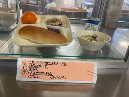 鶏肉とじゃがいものスープ煮、きのこのドリア、みかん、大型コッペ、ブルーベリージャム、牛乳