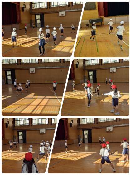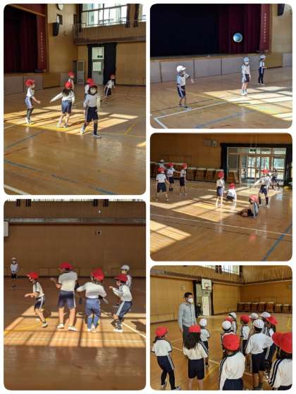 中チームはボールに当たらないようにコート内を上手に逃げ回ったり、外チームは外の子どうしでうまくボールを回して中の子を当てたりと、みんなよく考えて楽しく取り組むことができました。