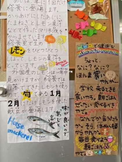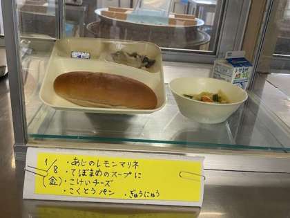 アジのレモンマリネ、テボ豆のスープ煮、固形チーズ、黒糖パン、牛乳