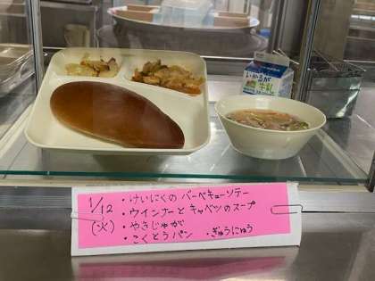 鶏肉のバーベキューソテー、ウィンナーとキャベツのスープ、焼きじゃが、黒糖パン、牛乳